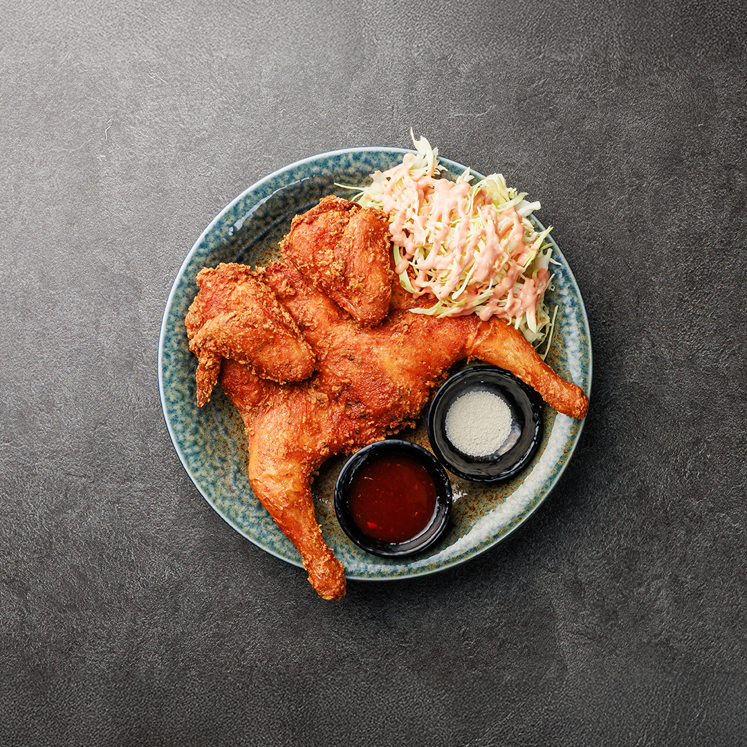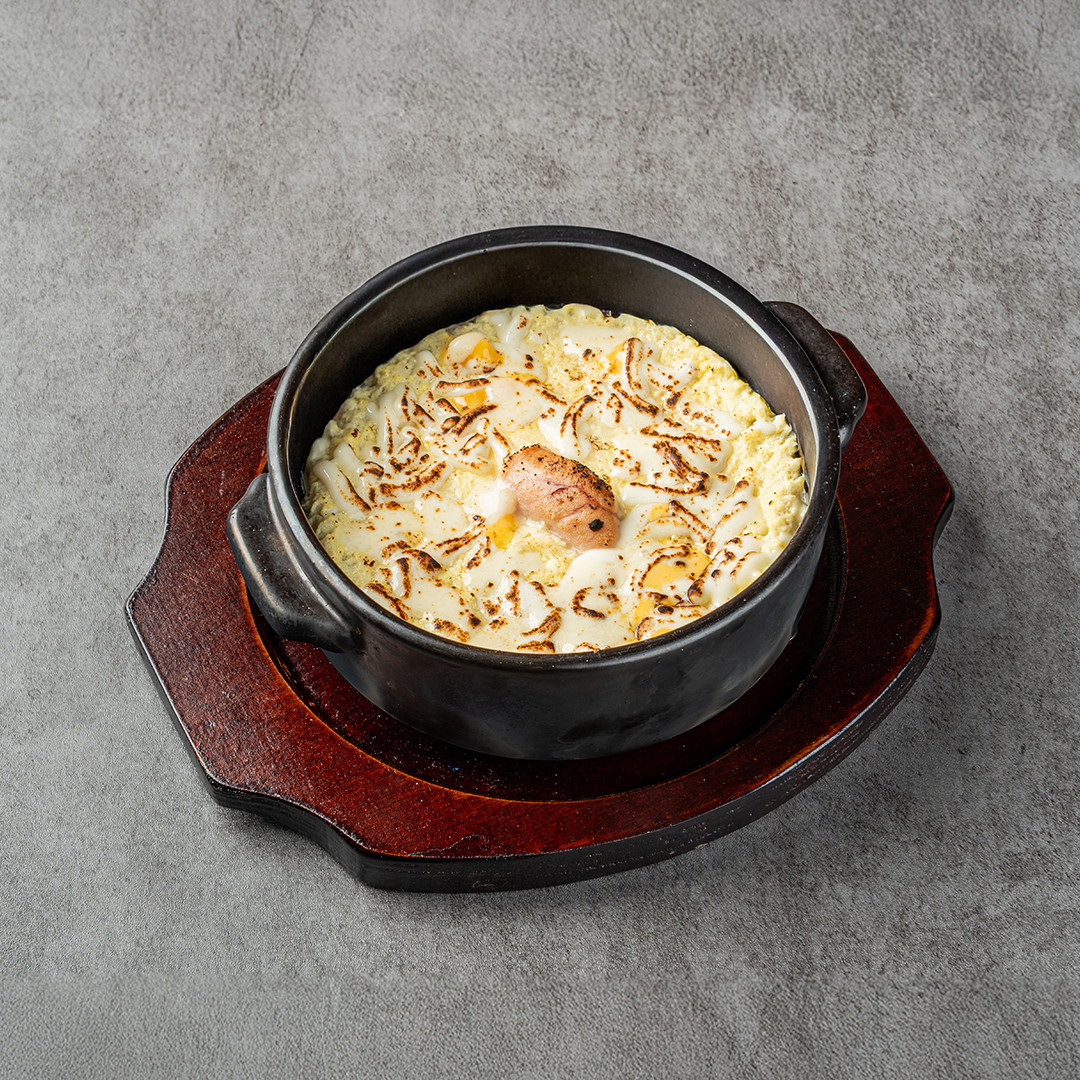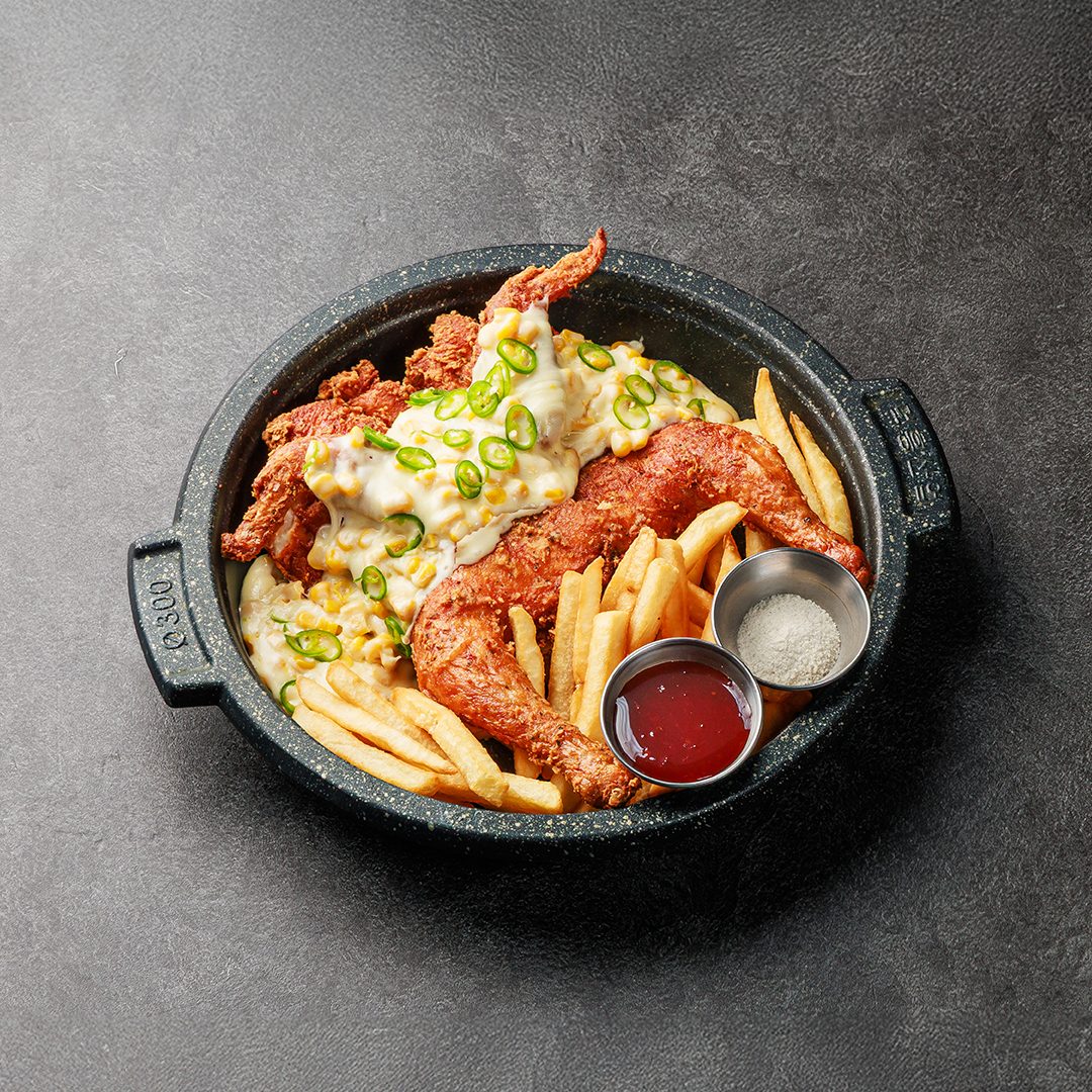 꾸덕한 콘치즈와 감자튀김으로 토핑된 겉바속촉 치킨 K-특제레트로치킨 치즈감튀